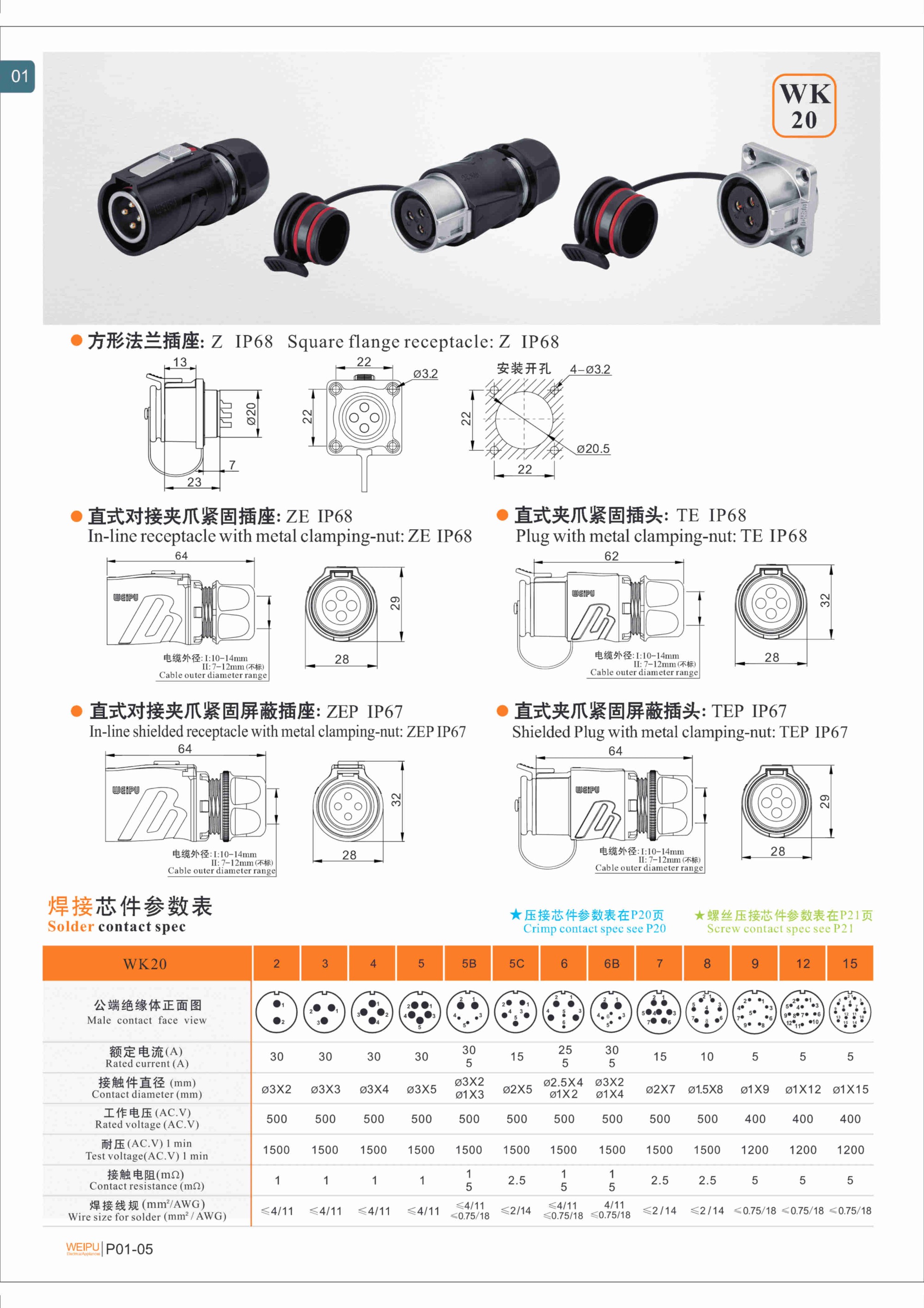 Technical SpecificationsIP68 WEIPU WK20 2Pin 3Pin 4Pin 5Pin 6Pin 7Pin 8Pin 9Pin 12Pin 15Pin Lock Hook Cirtcular M20 Connector